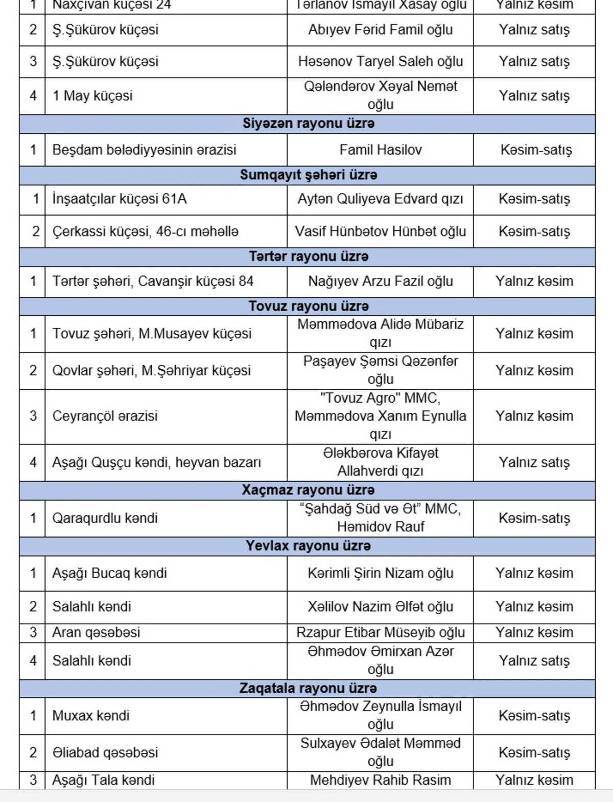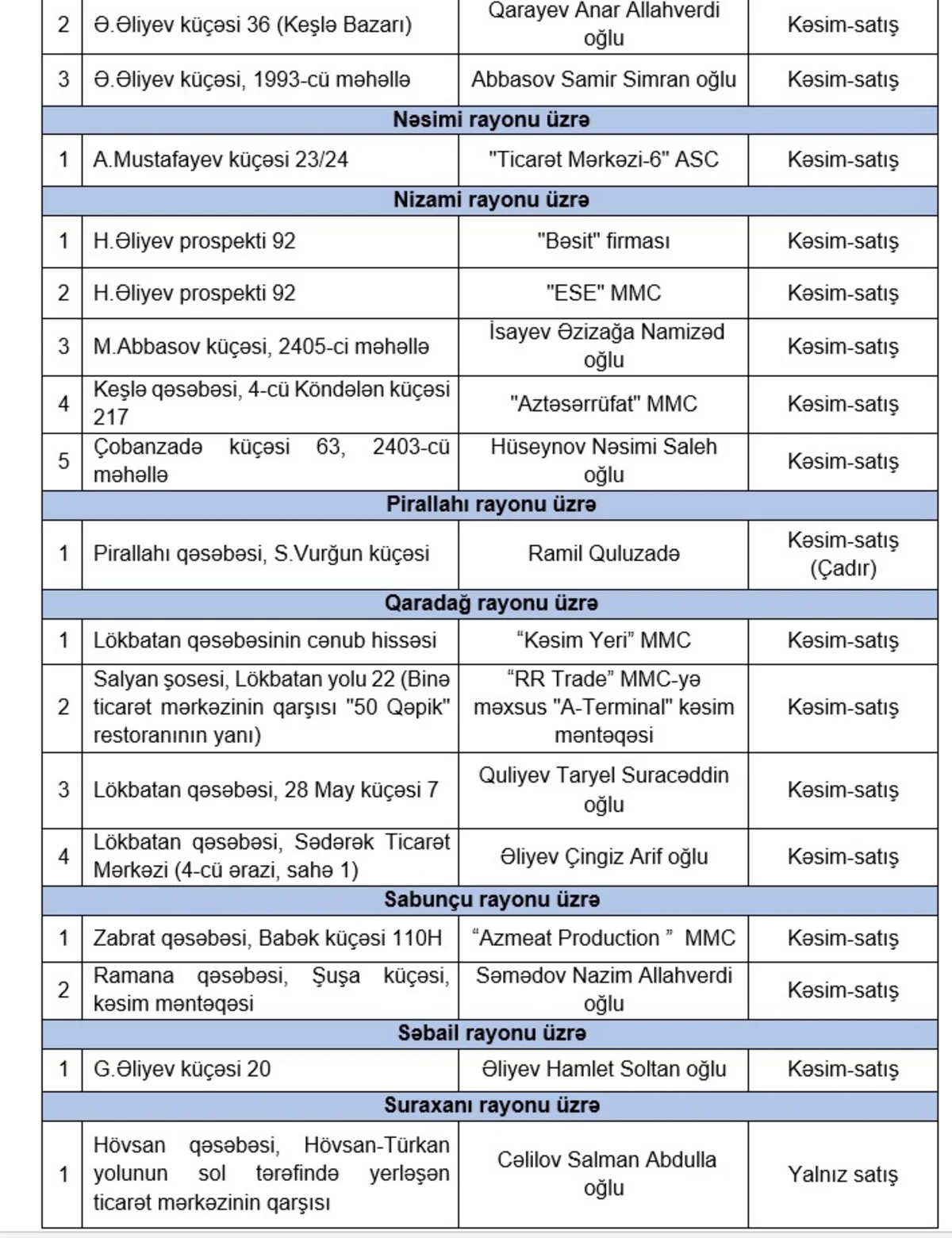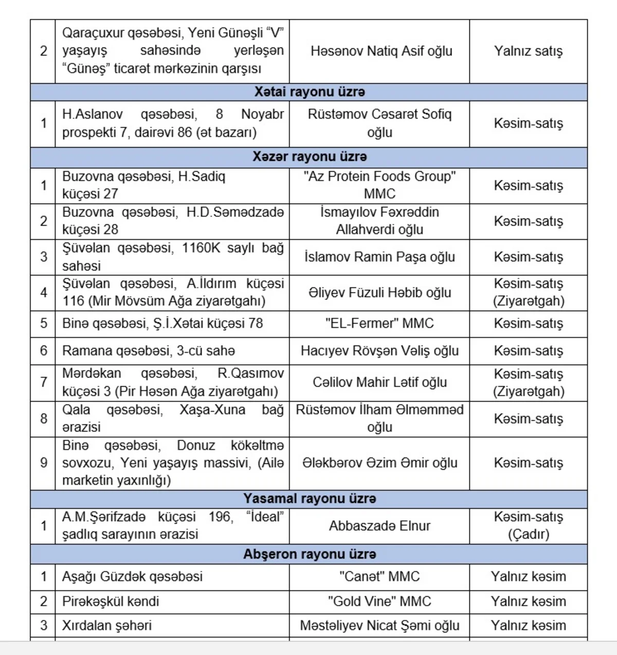 Qurban bayramı günlərində heyvanların satışı və kəsimi xidmətləri göstəriləcək ünvanlar açıqlanıb