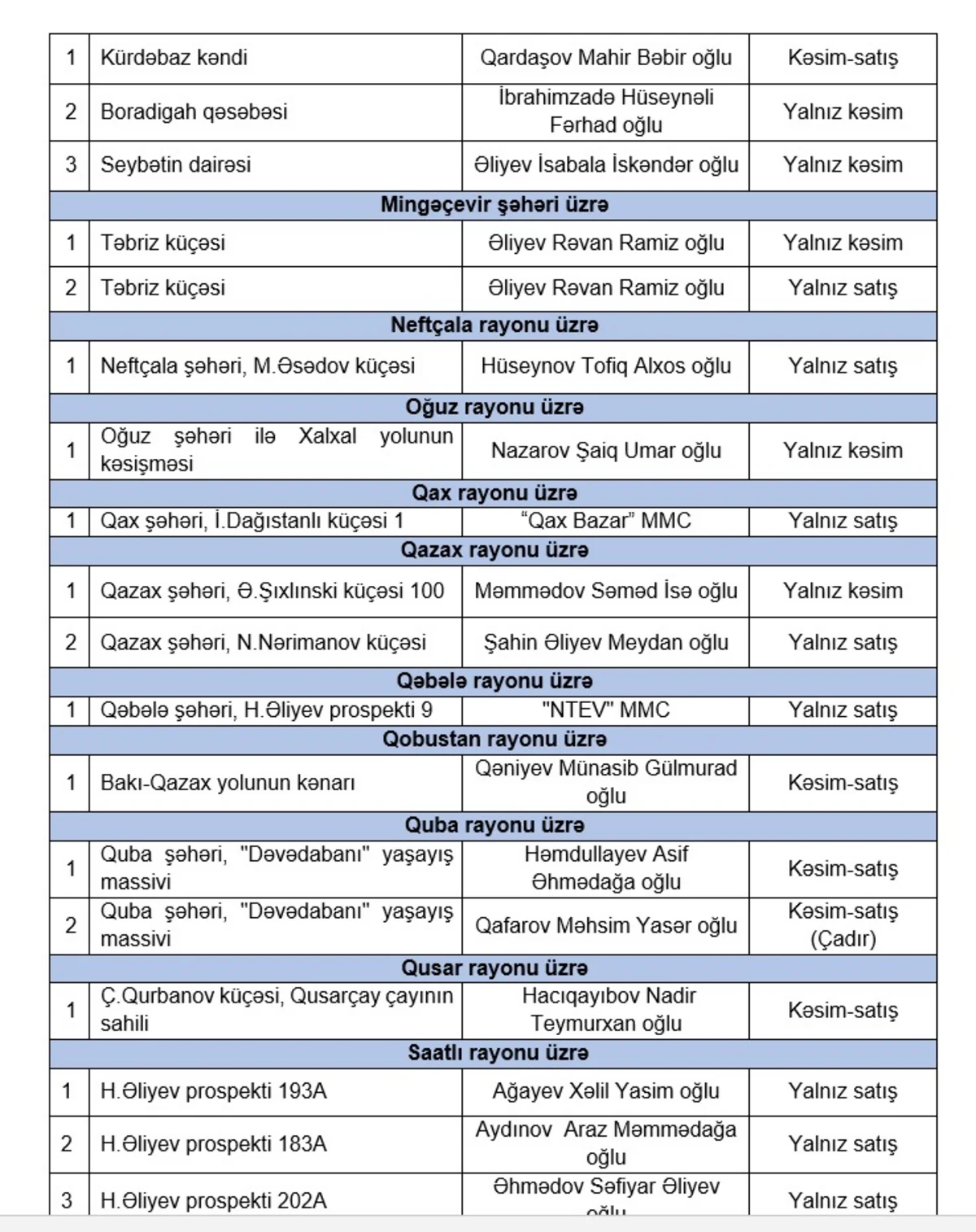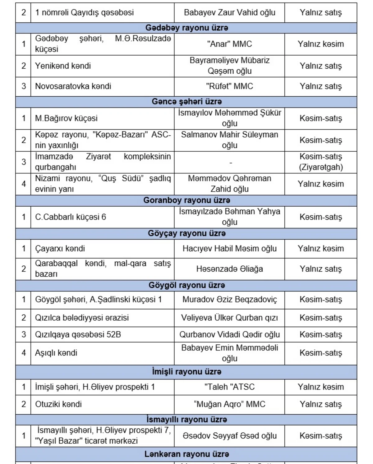 “Report”un Qida Təhlükəsizliyi Agentliyə istinadən verdiyi məlumata görə, 16, 17 iyun tarixlərində respublika üzrə 147 ünvanda fəaliyyət göstərəcək qurbanlıq heyvanların satışı və kəsimi yerlərindən 64-də həm kəsim, həm satış, 47-də qurbanlıq heyvanların yalnız satışı, 36-da isə yalnız heyvan kəsimi xidmətləri vətəndaşlara təklif olunacaq.