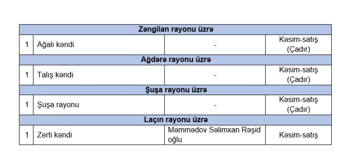 “Bununla yanaşı, bir sıra regionlarda Azərbaycan Respublikasının Qida Təhlükəsizliyi Agentliyi ilə razılaşdırılmaqla səyyar heyvan kəsimi çadırları quraşdırılaraq qurbanlıq heyvanların baytarlıq nəzarəti altında kəsimi və satışı həyata keçiriləcək”.
