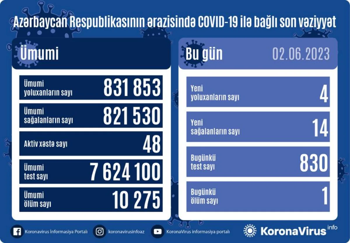 Məlumata görə, son sutka ərzində yeni yoluxma hallarının müəyyənləşdirilməsi ilə əlaqədar 830, bu günə qədər isə ümumilikdə 7 624 100 test icra olunub.