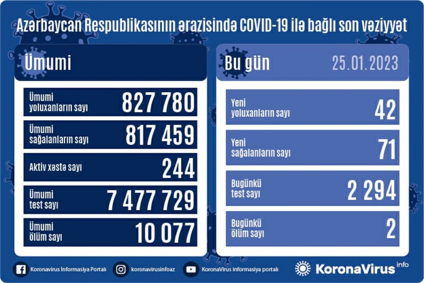 Son sutka ərzində yeni yoluxma hallarının müəyyənləşdirilməsi ilə əlaqədar 2 294, bu günə qədər isə ümumilikdə 7 477 729 test icra olunub.