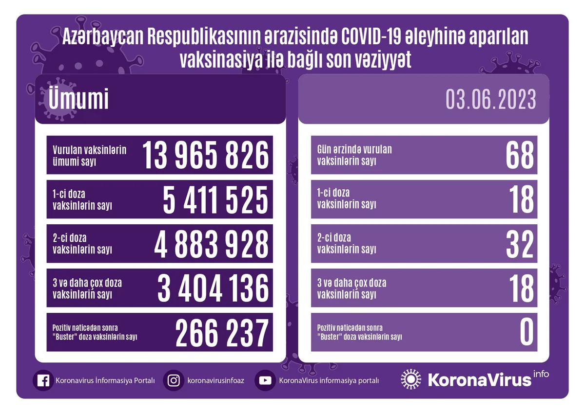 Azərbaycanda bu günə qədər vurulan vaksinlərin ümumi sayı isə 13 965 826 olub.