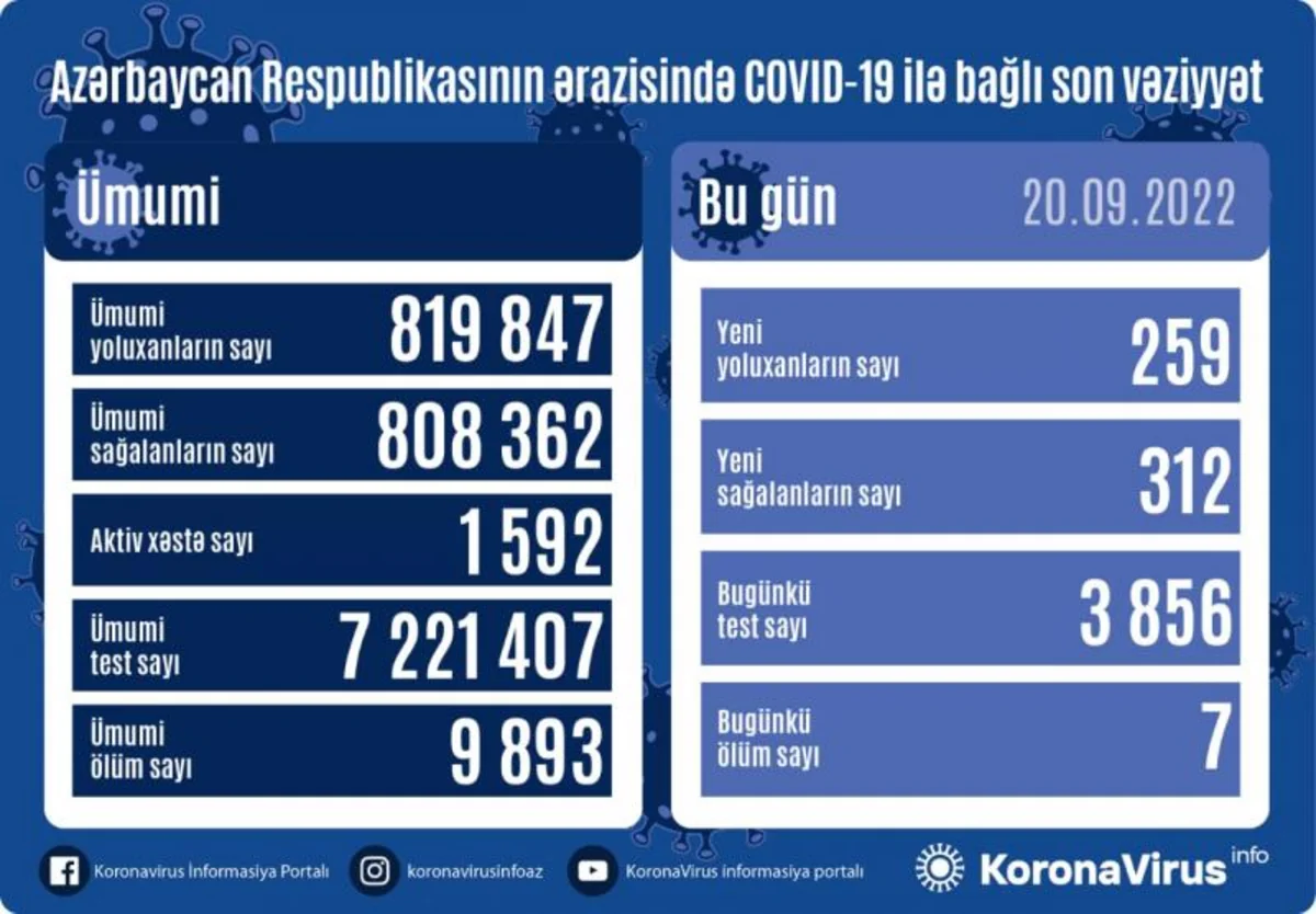 Azərbaycanda indiyədək ümumilikdə 819 847 nəfərin koronavirus infeksiyasına yoluxması faktı müəyyən edilib. Onlardan 808 362 nəfər müalicə olunaraq sağalıb, 9 893 nəfər vəfat edib, aktiv xəstə sayı 1 592 nəfərdir.
