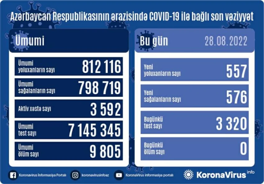 Son sutka ərzində yeni yoluxma hallarının müəyyənləşdirilməsi ilə əlaqədar 3 320, bu günə qədər isə ümumilikdə 7 145 345 test icra olunub.