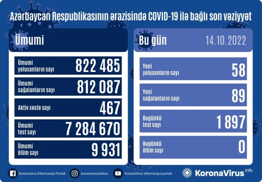 Son sutka ərzində yeni yoluxma hallarının müəyyənləşdirilməsi ilə əlaqədar 1 897, bu günə qədər isə ümumilikdə 7 284 670 test icra olunub.