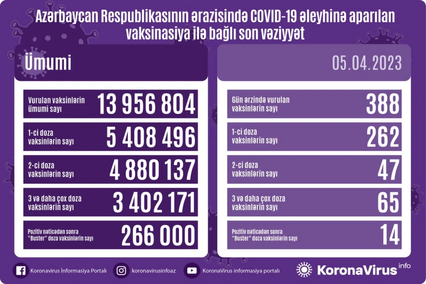 Azərbaycanda bu günə qədər vurulan vaksinlərin ümumi sayı isə 13 956 804 olub.