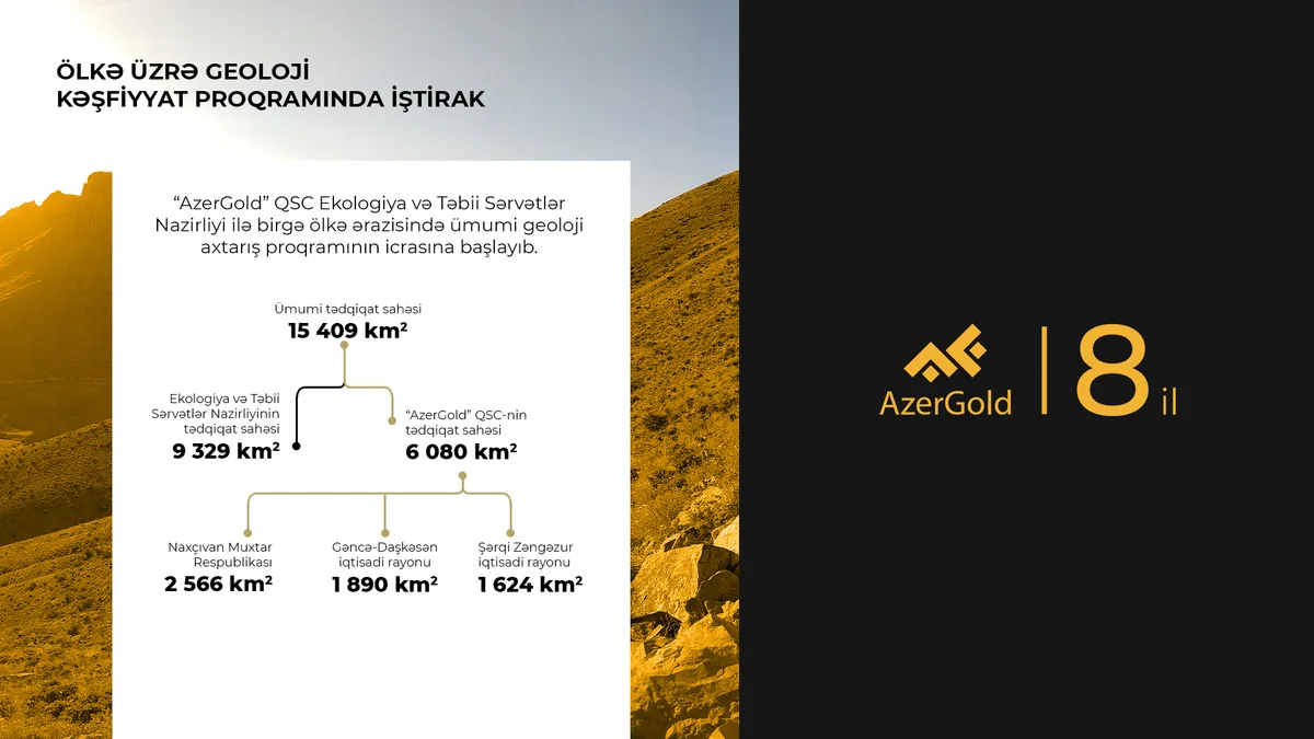 Milli dağ-mədən sənayesinin inkişafına davamlı töhfə verməyi qarşıya məqsəd qoyan “AzerGold” QSC Prezident İlham Əliyevin müvafiq Sərəncamına uyğun olaraq ölkə ərazisində mövcud olan filiz, qeyri-filiz yataq və təzahürləri üzrə geoloji kəşfiyyat proqramının icrasına dəstək göstərir. Ekologiya və Təbii Sərvətlər Nazirliyi ilə birgə icra olunan proqram 15409 km2 ərazini əhatə edir. “AzerGold” QSC-nin tədqiqat sahəsi isə 6080 km2-dir: