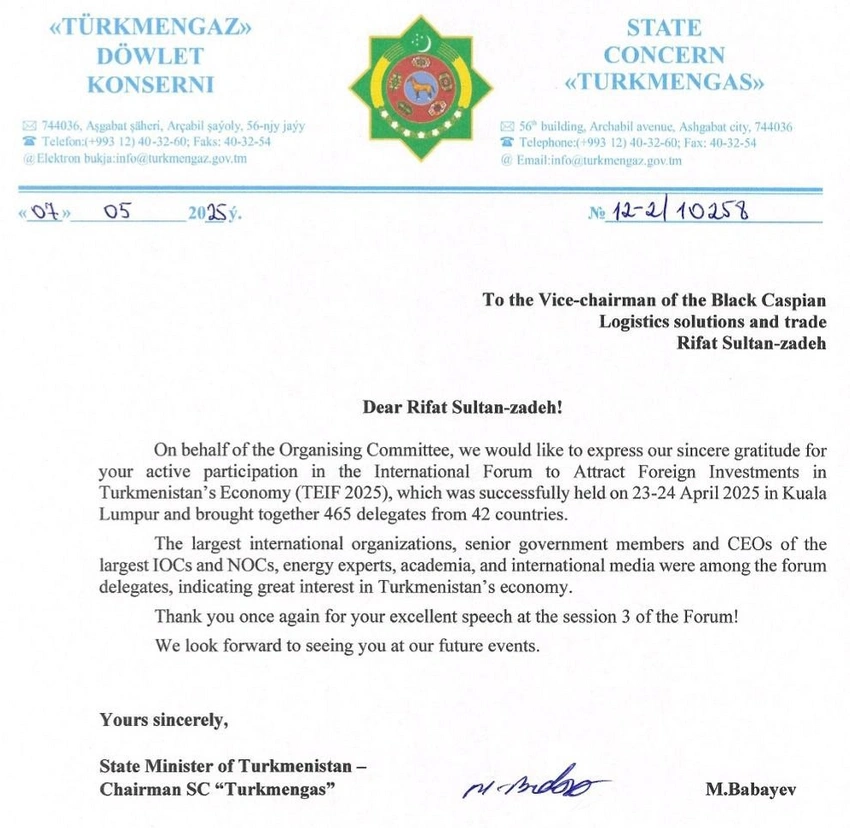 "Report" xəbər verir ki, Türkmənistanın dövlət naziri, "Türkmənqaz" dövlət konserninin sədri Maksat Babayev tərəfindən "Black Caspian Logistics and Trading" şirkətinin sədr müavini Rifat Sultanzadəyə çıxışına və Türkmənistanda keçirilən tədbirlərdə daimi iştirakına görə təşəkkür məktubu göndərilib.