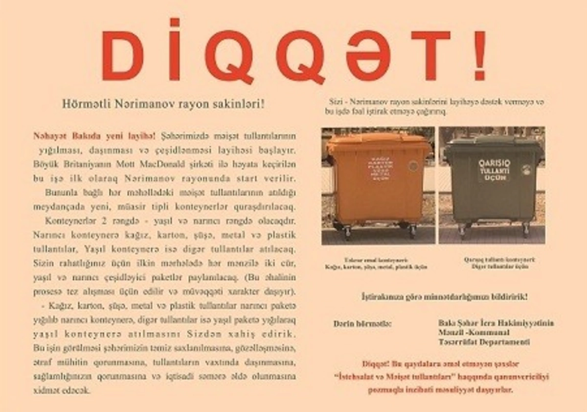 BŞİH-dən “Report”a verilən məlumata görə, Bakı Şəhər İcra Hakimiyyəti tərəfindən Böyük Britaniyanın tanınmış "Mott MacDonald" şirkəti ilə birgə paytaxtda həyata keçirilən yeni layihə - bərk məişət tullantılarının yığılması, daşınması və çeşidlənməsinin ən müasir səviyyədə təşkil edilməsi ilə bağlı sakinlərə məlumat verilib.
