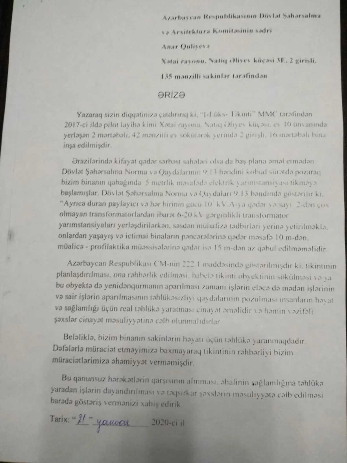 Sakinlər qeyd ediblər ki, yaşadıqları ərazidə kifayət qədər sərbəst sahələri olsa da, baş plana əməl etmədən Dövlət Şəhərsalma norma və qaydaların 9.13 bəndini kobud sürətdə pozaraq onların binalarının qabağında 5 metrlik məsafədə elektrik yarımstansiyası tikməyə başlanılıb: “Halbuki həmin qaydaların müvafiq bəndində göstərilir ki, ayrıca duran paylayıcı və hər birinin gücü 10 kubmetr kV.A-da qədər və sayı 2-dən çox olmayan transformatorlardan ibarət 6-20 kV gərginlikli transformator yarımstansiyaları yerləşdirilərkən, səsdən mühafizə tədbirləri yerinə yetirilməklə, onlardan yaşayış və ictimai binaların pəncərələrinə qədər məsafə 10 metrdən, müalicə-profilaktika müəssisələrinə qədər isə 15 metrdən az qəbul edilməməlidir”.