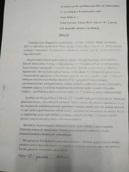 Binanın sakinləri qanunsuz hərəkətlərin qarşısının alınması, əhalinin sağlamlığına təhlükə yaradan işlərin dayandırılması və təqsirkar şəxslərin məsuliyyətə cəlb edilməsini barədə aidiyyatı qurumların göstəriş vermələrini xahiş edirlər.