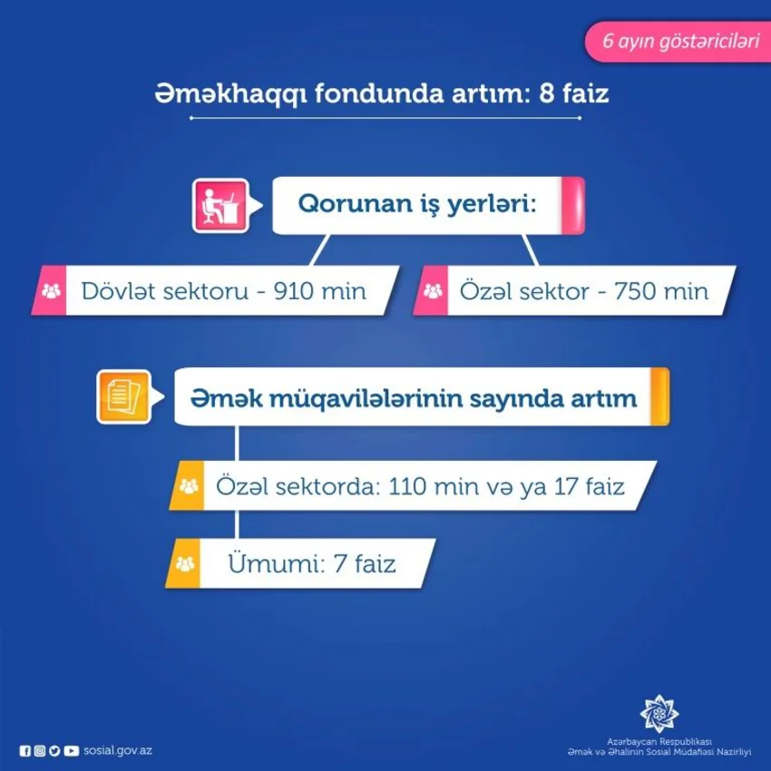 Nazir qeyd edib ki, hazırda özəl sektorda 750 min əmək müqaviləsi ilə çalışan var: "Dövlət və özəl sektor üzrə əmək müqavilələrinin sayında isə 7 faizlik artım baş verib. Əmək müqavilələrinin artımı kölgə iqtisadiyyatının azaldılması, qeyri-formal məşğulluğun leqallaşdırılması hesabına yaranır. Əmək müqavilələrinin artımı əməkhaqqı fondunun artmasına da səbəb olub. Bu ilin 6 ayında ölkədə əməkhaqqı fondu 8 faiz artıb. Bu, formal məşğulluğun əhatəsinin genişləndirilməsi baxımından da çox önəmlidir".