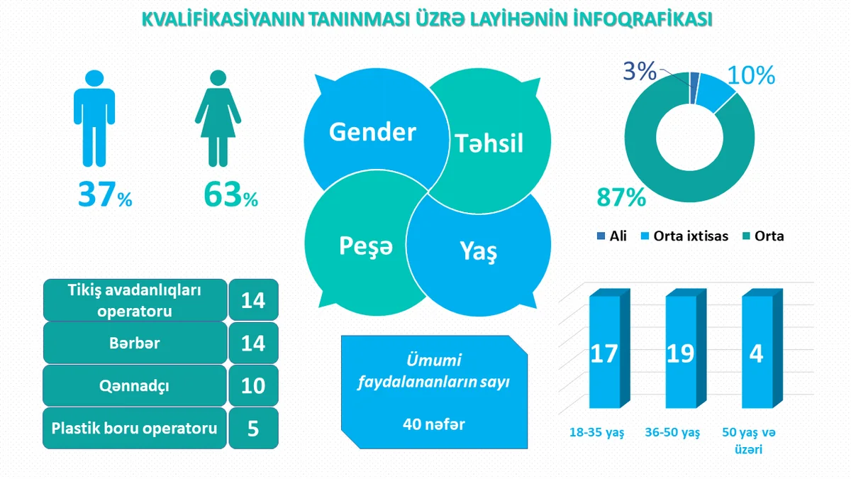 Layihənin hədəf qrupu formal təhsil ala bilməmiş məcburi köçkünlərdir. Həmin şəxslərin qənnadçı-şirniyyatçı, tikiş avadanlıqlarının operatoru-tikişçi, bərbər, plastik boru qaynaqçısı ixtisasları üzrə bilik və bacarığının artırılması və sonda dövlət nümunəli (ilk peşə təhsili üzrə sənədə bərabər) təhsil sənədinin verilməsi nəzərdə tutulub.