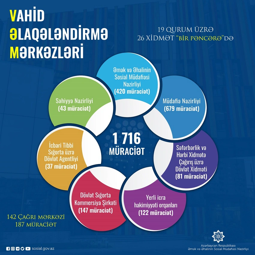 Bu günədək Bakıdakı DOST Mərkəzlərindəki vahid əlaqələndirmə mərkəzlərinə Vətən müharibəsi şəhidlərinin ailə üzvləri, müharibədə xəsarət almış hərbi qulluqçular və müharibə əlillərindən ibarət 1716 şəxs (o cümlədən “142 - Çağrı mərkəzi” vasitəsilə 187 şəxs) müraciət edib.