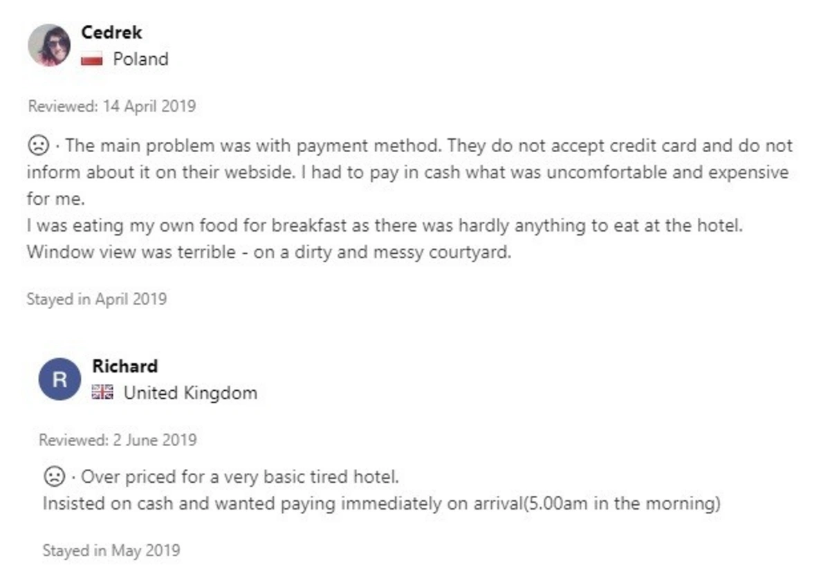 Digərləri isə ödəniş olunması üçün vaxt istədikləri halda, hotel administratorları tərəfindən səhər saat 5 olmasına baxmayaraq, dərhal ödəniş etməli olduqlarını bildiriblər. Ümumiyyətlə, ödənişlə bağlı bir çox ziyarətçilər rəylərdə öz şikayətlərini bölüşüblər. Belə ki, hoteldə qeyri-nağd ödəniş həyata keçirilməsi mümkün olmadığından turistləri kartlarındakı pulları dərhal nağdlaşdırmağa məcbur edirlər.
