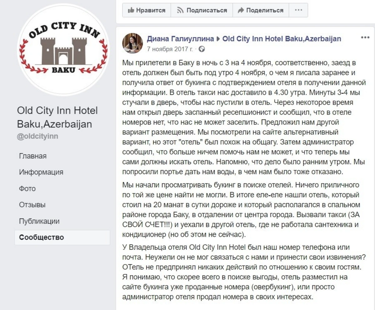 Diana Qaliullina adlı turist internet vasitəsilə nömrə bron etsə də, Bakıya gəldikdə həmin oteldə ona nömrənin boş olmadığını bildiriblər, əvəzində bərbad şəraitdə digər hoteli tövsiyə ediblər, müştəri razılaşmayanda isə qalmağa başqa yer axtarmağı bildiriblər. D.Qaliullina yazır ki, hotel rəhbərliyində onların telefon nömrəsi və digər əlaqə vasitələri olsa da, heç bir xəbərdarlıq etmədən bron olunmuş nömrəni digərlərinə satıblar.