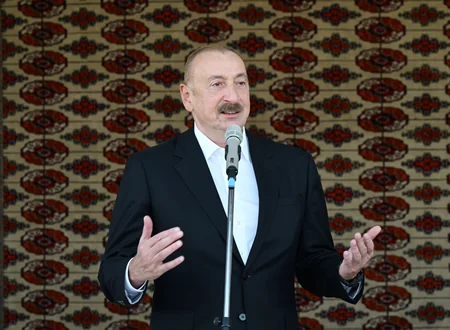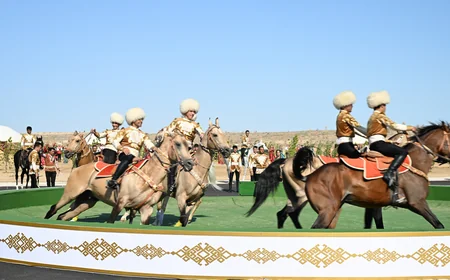 Azərbaycan Prezidenti İlham Əliyev, Türkmənistan Xalq Məsləhətinin sədri Qurbanqulu Berdiməhəmmədov və Özbəkistan Prezidenti Şavkat Mirziyoyev Türkmənbaşı şəhərində “Axaltəkə” atlarına və milli “Galkynysh” atlı qrupunun çıxışına baxıblar.