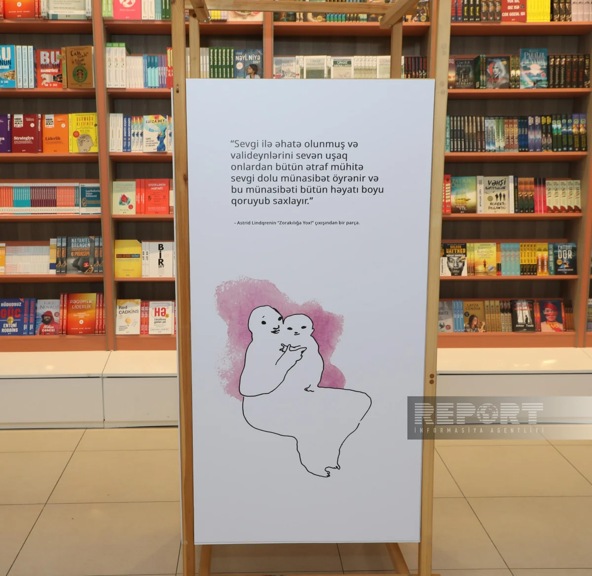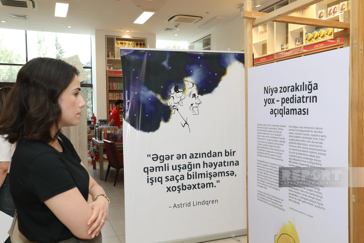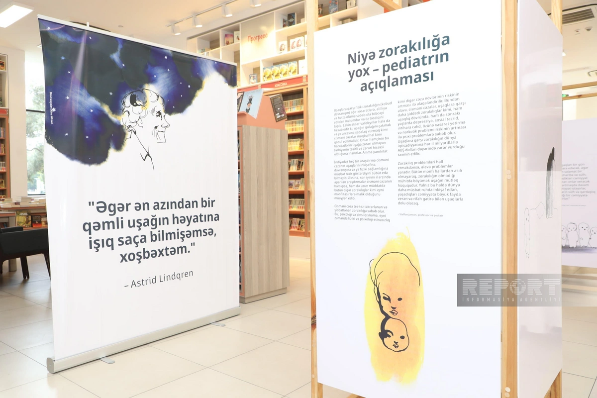 "Report" xəbər verir ki, ekspozisiyada uşaqlara zorakılıq tətbiq etmədən sevgi və hörmət göstərməyin vacibliyini vurğulayan məşhur İsveç yazıçısı Astrid Lindqrenin sitatları yer alıb.