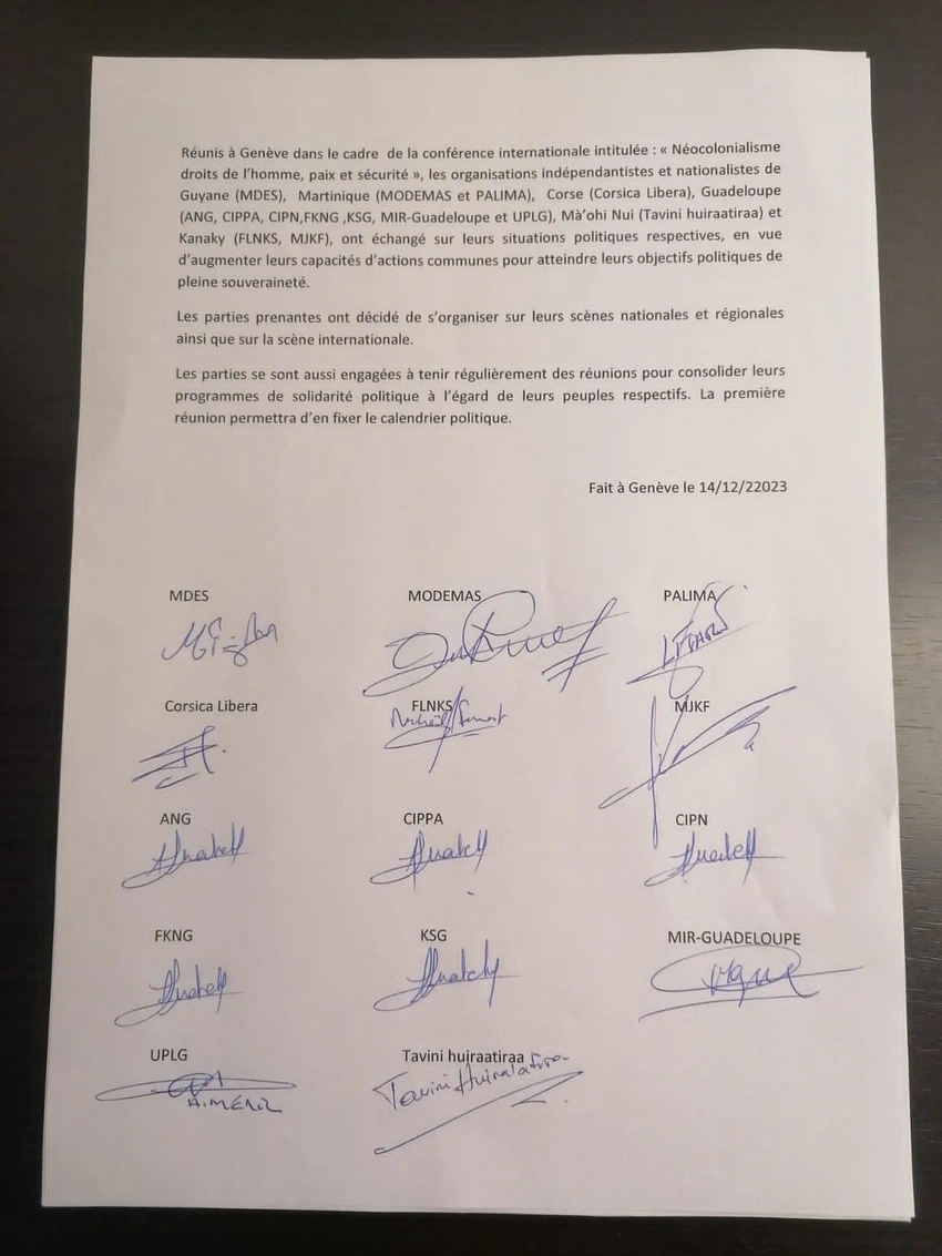 “Report” xəbər verir ki, “Neokolonializm: İnsan hüquqları, Sülh və Təhlükəsizlik” adlı beynəlxalq konfrans çərçivəsində Cenevrədə bir araya gəlmiş Fransız Qvianası (MDES), Martinik (MODEMAS və PALİMA), Korsika (Azad Korsika), Qvadelupa (ANG, CİPPA, CİPN, FKNG, KSG, MİR-Qvadelupa və UPLG), Fransız Polineziyası (özləri ölkələrini Ma’o Nuii adlandırır) (TAVİNİ Huiraatiraa) və KANAKY (Yeni Kaledoniya) (FLNKS, MJKF) ölkələrindən olan millətçi və müstəqillik uğrunda mübarizə aparan təşkilatlar tam suverenliyə dair siyasi məqsədlərinə çatmaq üçün birgə addımların atılması imkanlarının gücləndirilməsi məqsədilə ölkələrində cari siyasi vəziyyətlərinə dair fikir mübadiləsi apardılar.