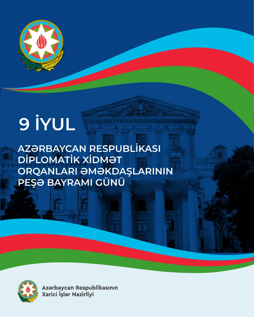 "9 iyul – Diplomatik xidmət orqanları əməkdaşlarının peşə bayramı günündə, milli maraqlarımızın qorunması və beynəlxalq aləmdə mövqeyimizin gücləndirilməsi istiqamətində əzmlə çalışan diplomatlarımıza davamlı nailiyyətlər arzulayıram. Peşə bayramınız mübarək!", - paylaşımda deyilir.