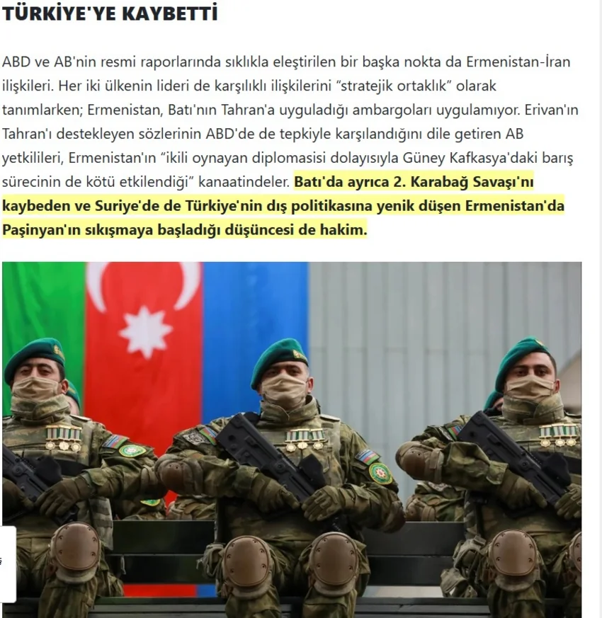 “Adıçəkilən təhlil məqaləsində Nikol Paşinyanın 2020-ci ildə baş verən həlledici diplomatik və hərbi əməliyyatlarla başa çatan İkinci Qarabağ müharibəsində Rusiyadan dəstək ala bilmədiyi üçün qəzəbləndiyi bildirilib”.