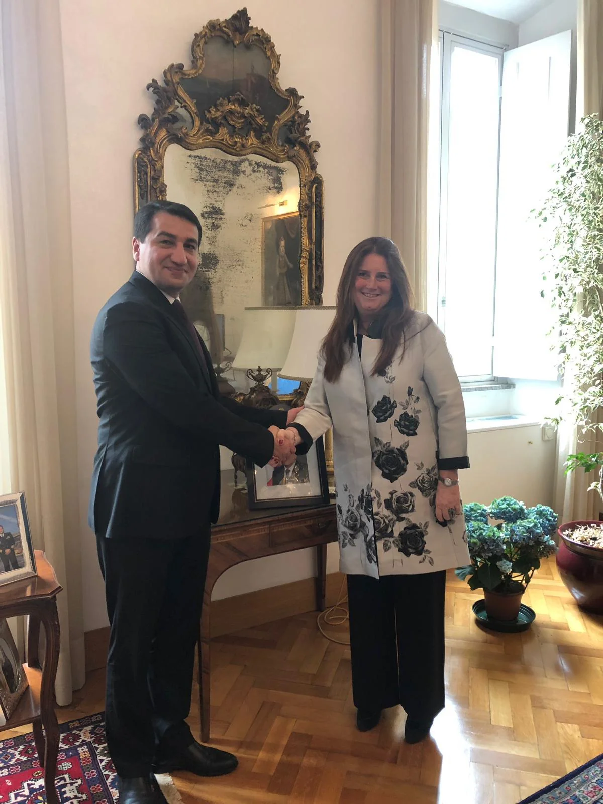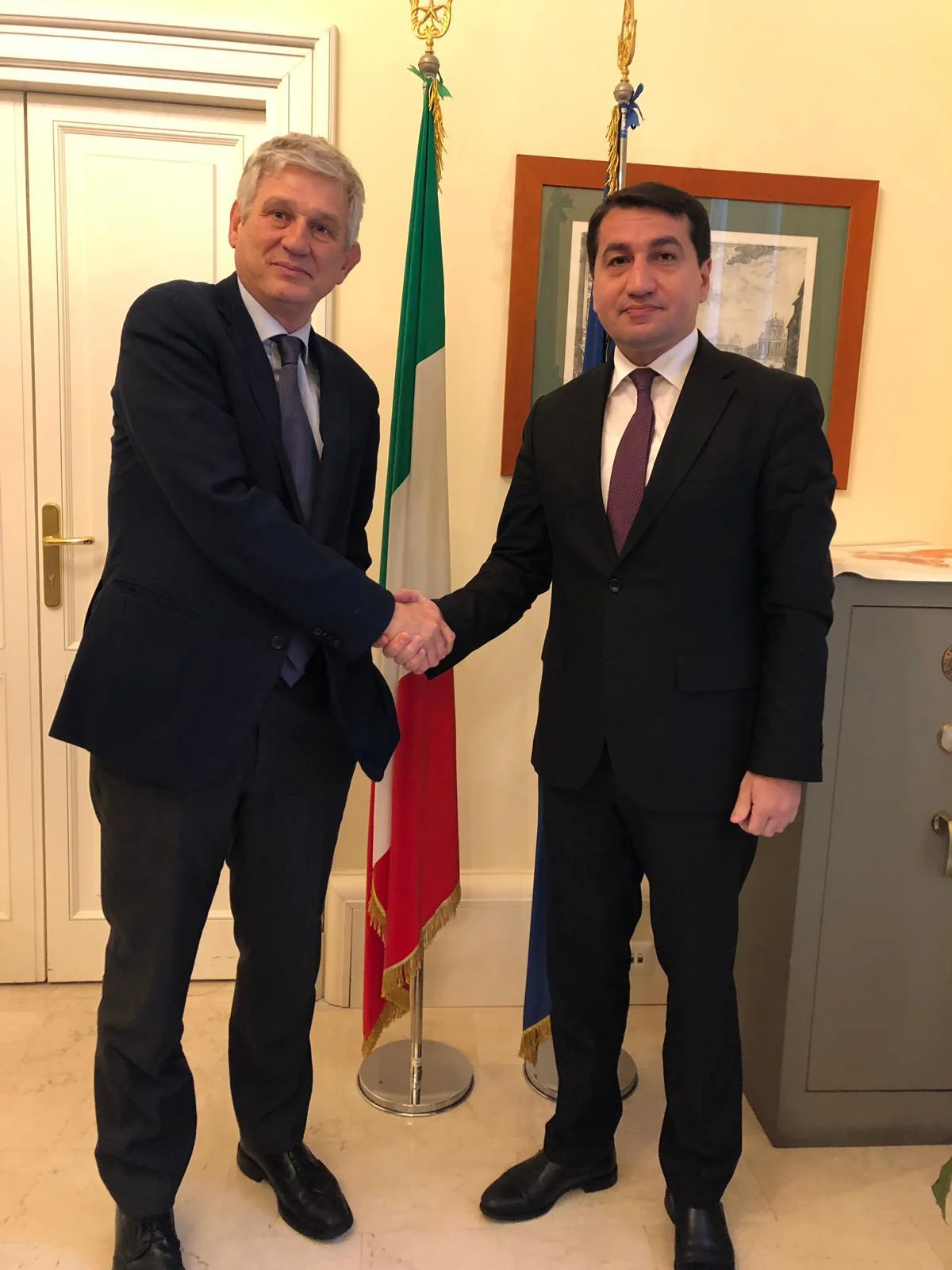 Azərbaycan Prezidenti Administrasiyasının Xarici siyasət məsələləri şöbəsinin müdiri Hikmət Hacıyev İtaliyaya səfəri çərçivəsində İtaliya Prezidentinin diplomatik müşaviri səfir Emanuela D’Alessandro, həmin ölkənin Baş nazirinin diplomatik müşaviri səfir Pietro Benassi və İtaliya Xarici İşlər və Beynəlxalq Əməkdaşlıq Nazirliyinin Siyasi Məsələlər və Təhlükəsizlik Baş Direktorluğunun rəhbəri səfir Sebastiano Kardi ilə görüşlər keçirib.
