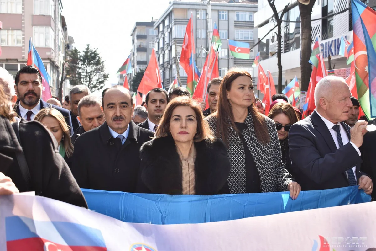 “Xocalıya Ədalət” şüarları ilə keçirilən yürüşdə Azərbaycan Prezidentinin ictimai-siyasi məsələlər üzrə köməkçisi Əli Həsənov, tanınmış şairə Sona Vəliyeva, Milli Məclisin deputatı Qənirə Paşayeva, Türkiyə-Azərbaycan parlamentlərarası dostluq qrupunun rəhbəri Şamil Ayrım, Azərbaycanın İstanbuldakı baş konsulu Məsim Hacıyev, İstanbulun Bağcılar rayonunun icra başçısı Mustafa Eldivan, Türkiyə Böyük Millət Məclisinin millət vəkilləri, Baş konsulluğun, ictimai birliklərin əməkdaşları, KİV nümayəndələri iştirak ediblər.