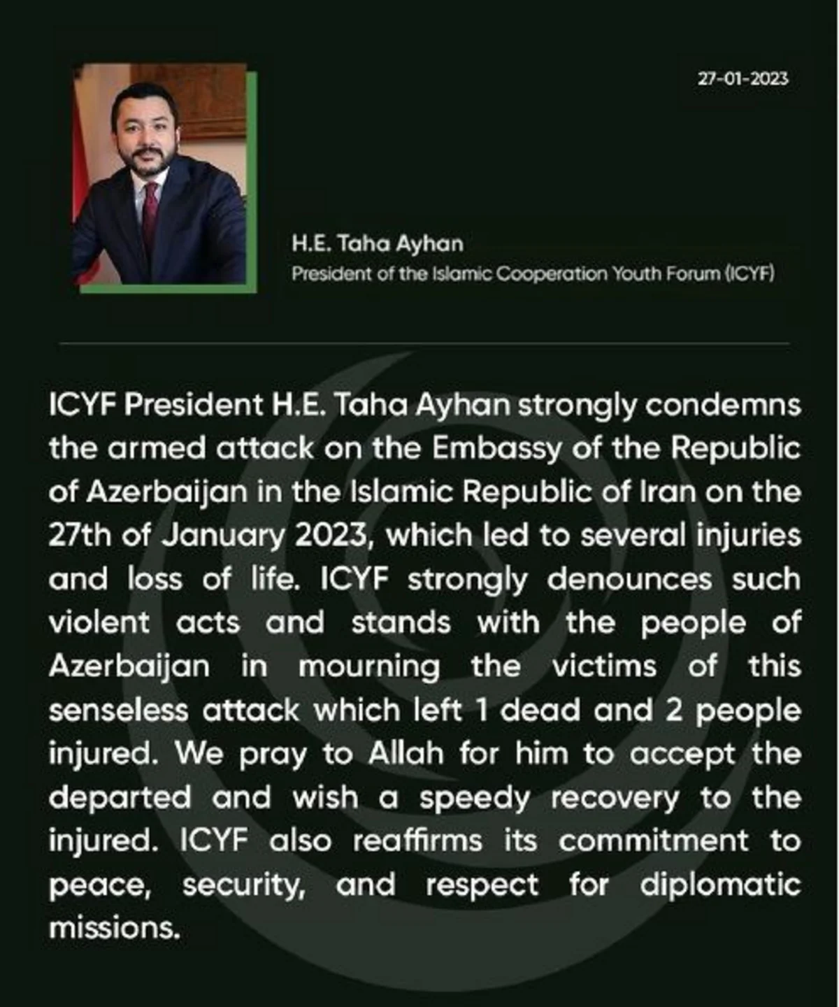 “Yanvarın 27-də Azərbaycan Respublikasının İran İslam Respublikasındakı Səfirliyinə edilən və bir neçə insanın yaralanması və tələfatı ilə nəticələnən silahlı hücumu qətiyyətlə pisləyirik. İKGF Azərbaycan xalqının yanındadır. Allah dünyasını dəyişənlərə rəhmət eləsin. Yaralılara şəfa diləyirik”.