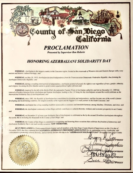 Tədbirdə həmçinin San Dieqo şəhərində və vilayətində 31 dekabrın “Azərbaycanlıların Həmrəylik Günü” elan olunmasına dair müvafiq bəyannamələr təqdim olunub.
