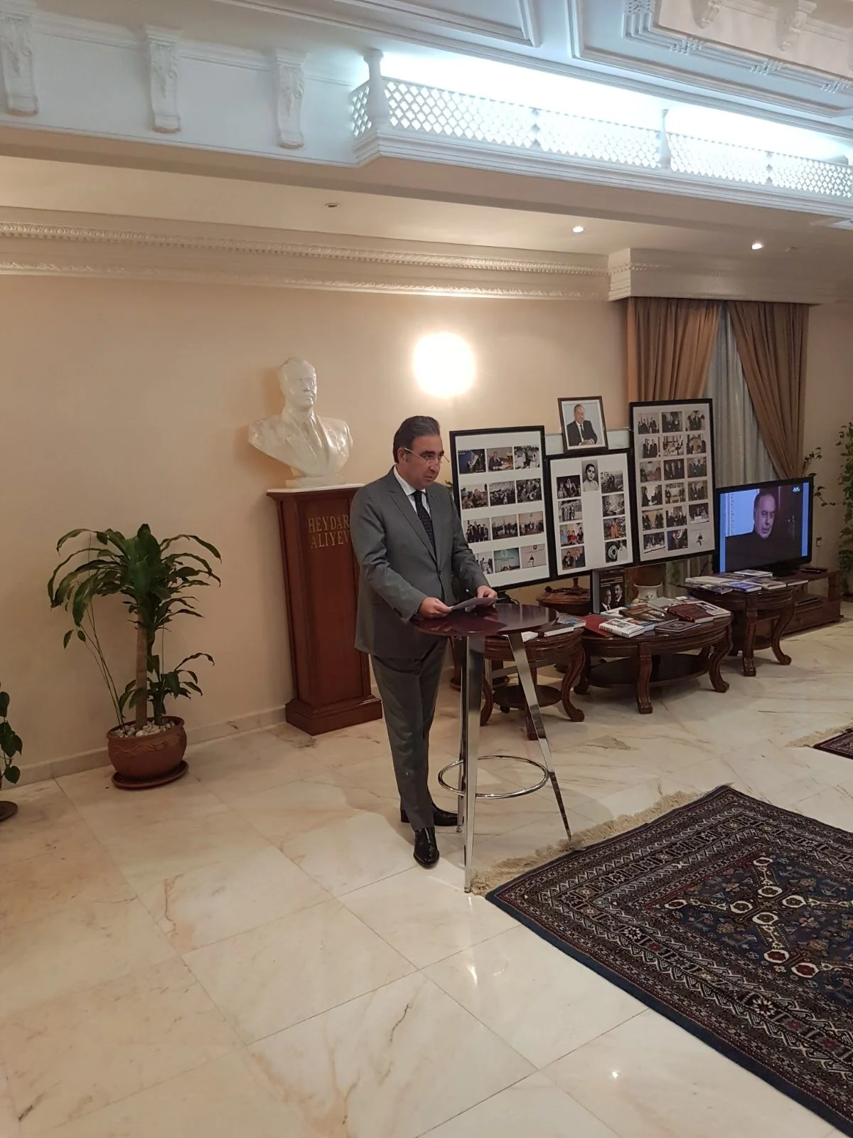 Bununla yanaşı, səfirliyimizdə ulu öndərin xatirəsinə həsr olunmuş fotosərgi və həyat və fəaliyyətindən bəhs edən kitablar nümayiş etdirilib. Daha sonra tədbir iştirakçıları müasir Azərbaycanın banisi Heydər Əliyev barədə sənədli filmə tamaşa ediblər.