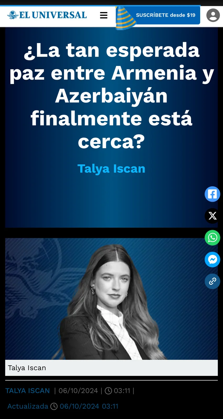 Meksikanın geniş oxuyucu kütləsinə malik olan və ölkənin ən nüfuzlu “El Universal” qəzetində “Ermənistanla Azərbaycan arasında çoxdan gözlənilən sülh artıq yaxındırmı?” başlıqlı məqalə dərc olunub.