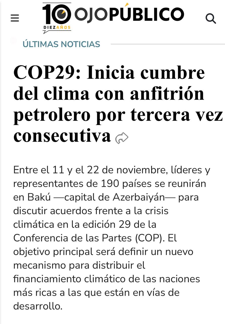 “El Peruano”, “La Razon” qəzetləri, eləcə də “Infobae” və “OjoPúblico” kimi onlayn platformalarda yayımlanan materiallarda COP29-un əhəmiyyəti geniş şəkildə vurğulanır. Məqalələrdə qeyd olunur ki, iqlim dəyişikliyi ilə mübarizə üzrə konkret addımları müzakirə etmək üçün dünyanın müxtəlif ölkələrindən dövlət və hökumət başçıları, alimlər və ekoloji fəallar Bakıda bir araya gəliblər.