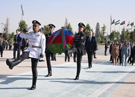 Prezident İlham Əliyev abidənin önünə əklil qoydu.