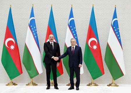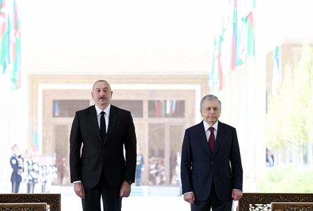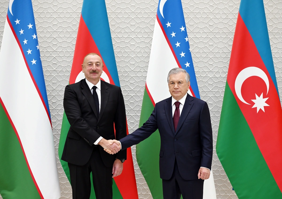 Özbəkistan Respublikasının Prezidenti Şavkat Mirziyoyev Azərbaycan Respublikasının Prezidenti İlham Əliyevi qarşılayıb.
