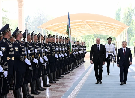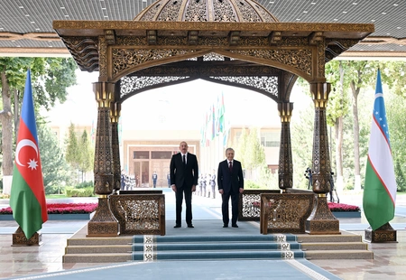 Prezident İlham Əliyevi və birinci xanım Mehriban Əliyevanı Özbəkistan Prezidenti Şavkat Mirziyoyev və xanımı Ziroatxon Mirziyoyeva qarşılayıblar.