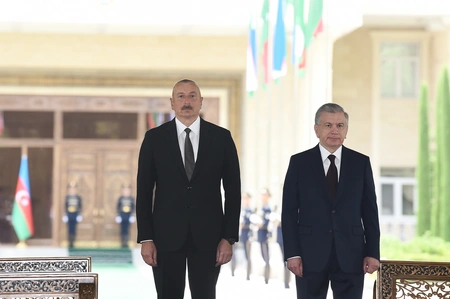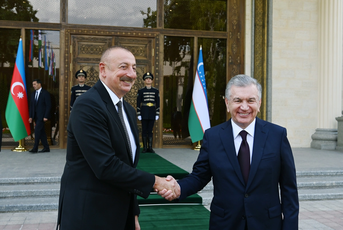 Özbəkistan Respublikasının Prezidenti Şavkat Mirziyoyev Azərbaycan Respublikasının Prezidenti İlham Əliyevi qarşılayıb.