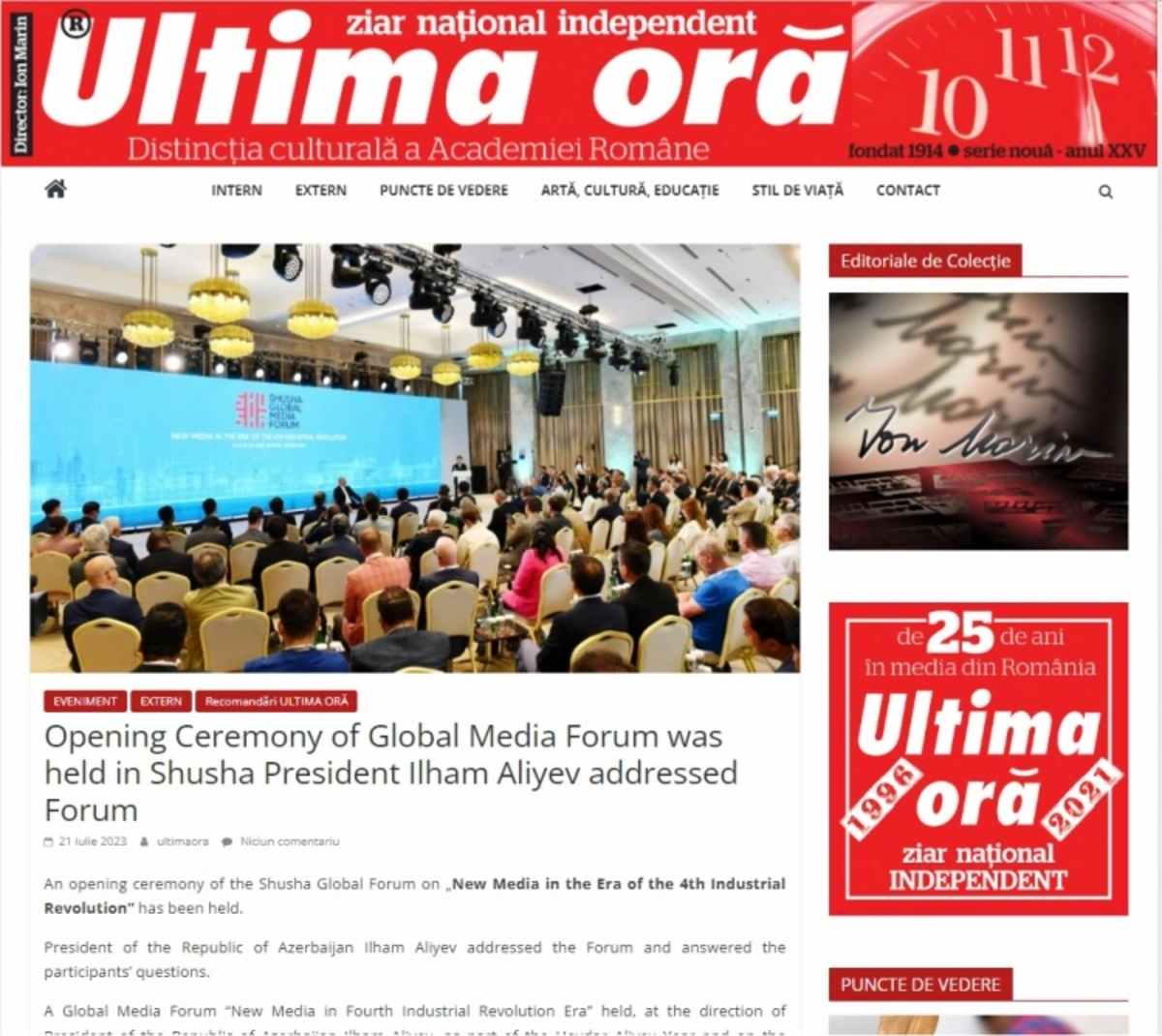 Rumıniya mətbuatı Şuşada keçirilən Qlobal Media Forumundan yazıb