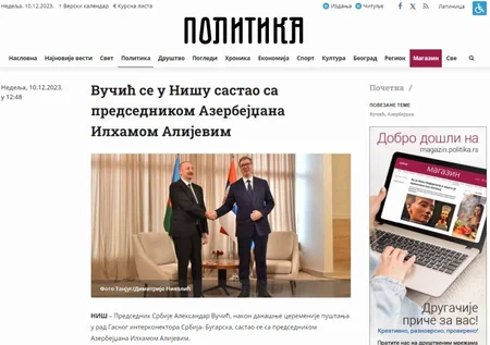 “Beta”, “Politika”, “SRNA”, “Alo” və “Gradske info” xəbər portalları isə Azərbaycan Prezidenti İlham Əliyev və Serbiya Prezidenti Aleksandar Vuçiçin təkbətək görüşdə ölkələr arasında ikitərəfli və iqtisadi əlaqələrin qarşılıqlı maraq doğuran bütün vacib mövzular ətrafında müzakirələr apardığını yazıb. İki ölkə lideri, həmçinin regional və geosiyasi məsələləri də müzakirə edib. Serbiya Prezidenti ölkəsinin Azərbaycanla strateji tərəfdaşlıq səviyyəsinə yüksəlmiş əla münasibətlər qurmağı bacarmasından qürur duyduğunu deyib.