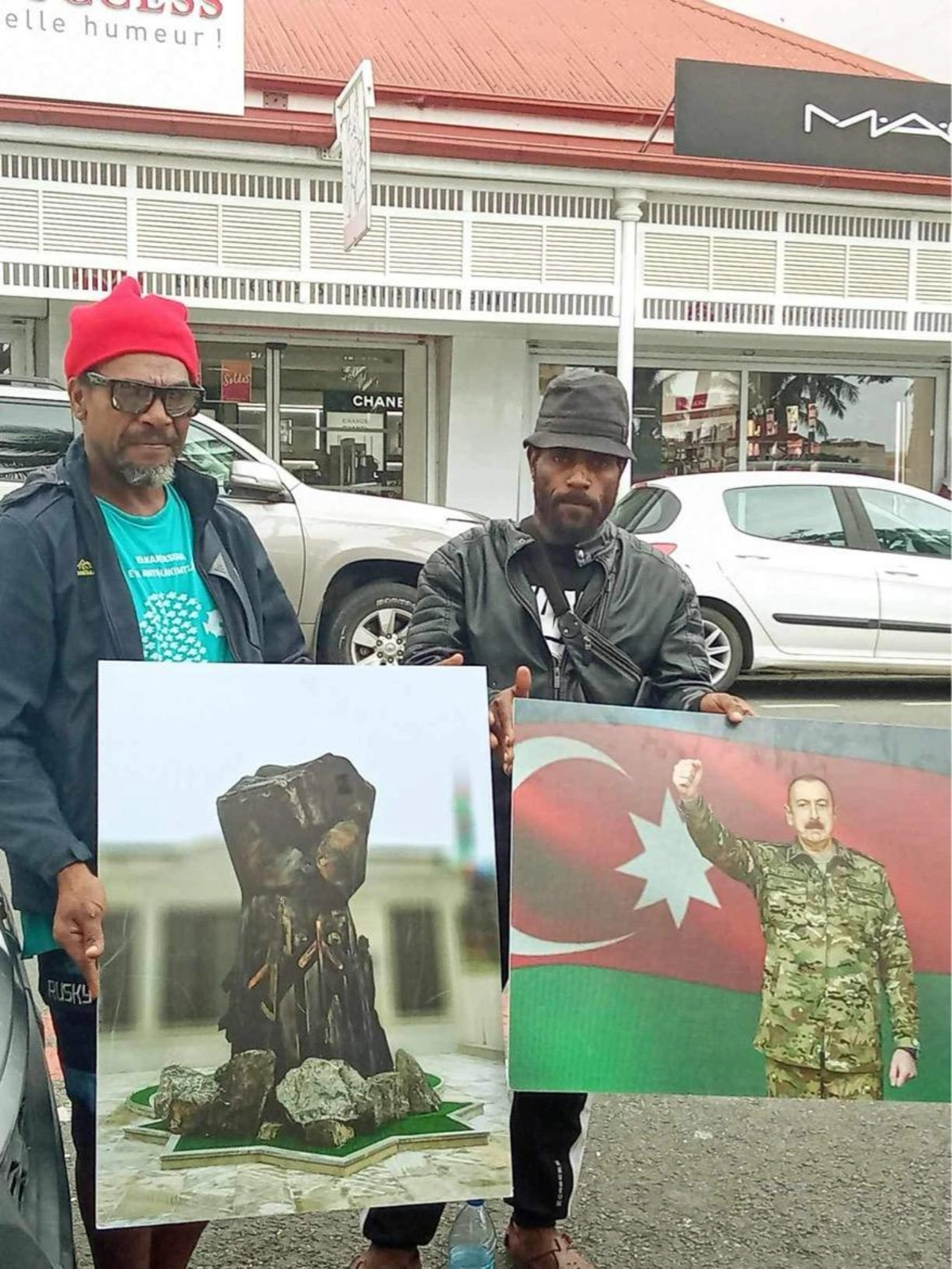 İki gün müxtəlif şüarlarla davam edən aksiyalarda Prezident İlham Əliyevin və "Dəmir Yumruğ"un fotolarının əks olunduğu plakatlar qaldırılıb, Azərbaycan və Yeni Kaledoniya bayraqları dalğalandırılıb, hətta bəzi aksiya iştirakçılarının əynindəki köynəklərin üzərində Azərbaycan və kanak bayraqları olub.